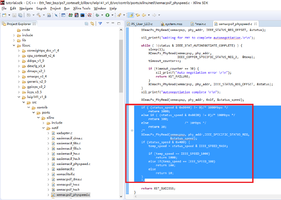 PL部分根据硬件电路选择对应的网络口,如图:![]() (米尔开发板需要注意,核心板没有提供原理图,有些芯片的复位脚由MIO引出,配置时需要注意,如果没有按照提供的示例设置,可能出现某些芯片无法工作。) 这是米尔C7Z01020核心板MIO需要额外注意的地方,MIO7是系统复位引脚,也需要设置。 ![]() PL部分设置完成后按照教程导出硬件。启动SDK。 点击菜单栏上的File -> New -> Application Project 在弹出的对话框中输入工程名,在Board Support Package中生成新的BSP文件,其他保持默认,点击Next。 ![]() 在模板里选择lwip Echo Server,点击Finish。 Xilinx的很多开发板使用Marvell的网络芯片,参考资料较少,米尔开发板做了适当替换,所以有些驱动需要修改。 工程的main.c文件中,添加相应的头文件: ![]() 主函数中加入相应寄存器操作: ![]() 然后对判断网络带宽驱动函数做修改,在Eth_Test_bsp -> ps7_cortexa9_0 -> libsrc -> contrib -> ports -> xilinx -> netif -> xemacpsif_physpeed.c文件,修改get_Marvell_phy_speed函数: ![]() 开发板连接带DHCP功能的路由器,下载程序,可以从串口打印出的数据。 ![]() 电脑连接在同一个网段,通过CMD命令窗口可以ping通开发板: ![]() 通过网络调试助手,可以作为TCP客户端连接到开发板,发送的数据开发板会回传回来。 |